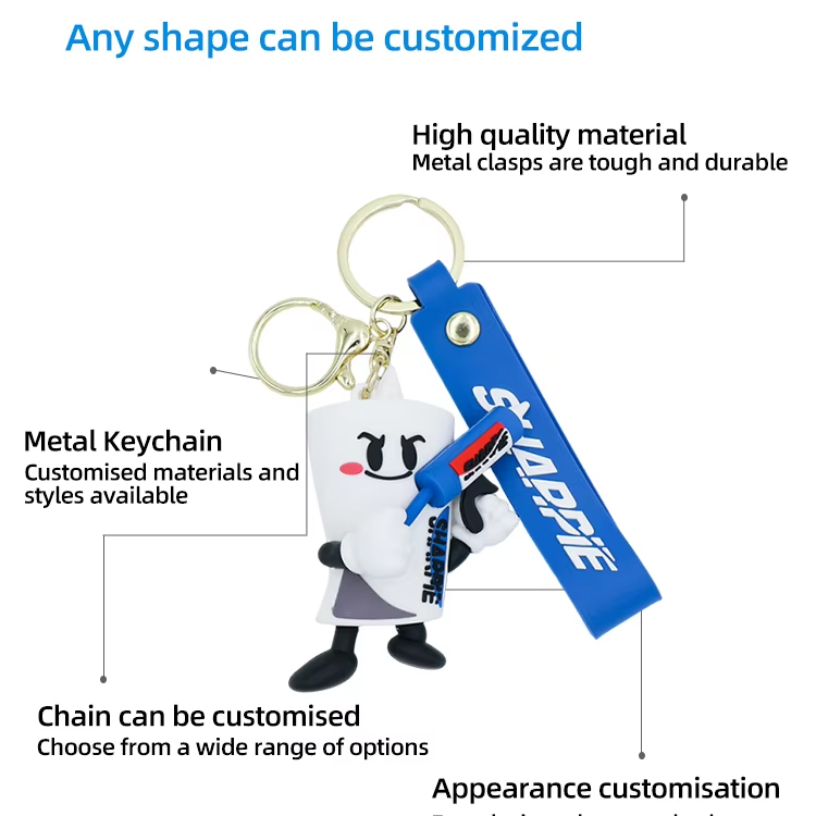 Wujudkan merek atau ide Anda dengan desain 2D atau 3D yang dapat disesuaikan sepenuhnya. Baik itu logo, maskot, atau slogan, gantungan kunci PVC lembut kami dirancang agar sesuai dengan visi Anda dengan warna cerah dan detail tinggi.