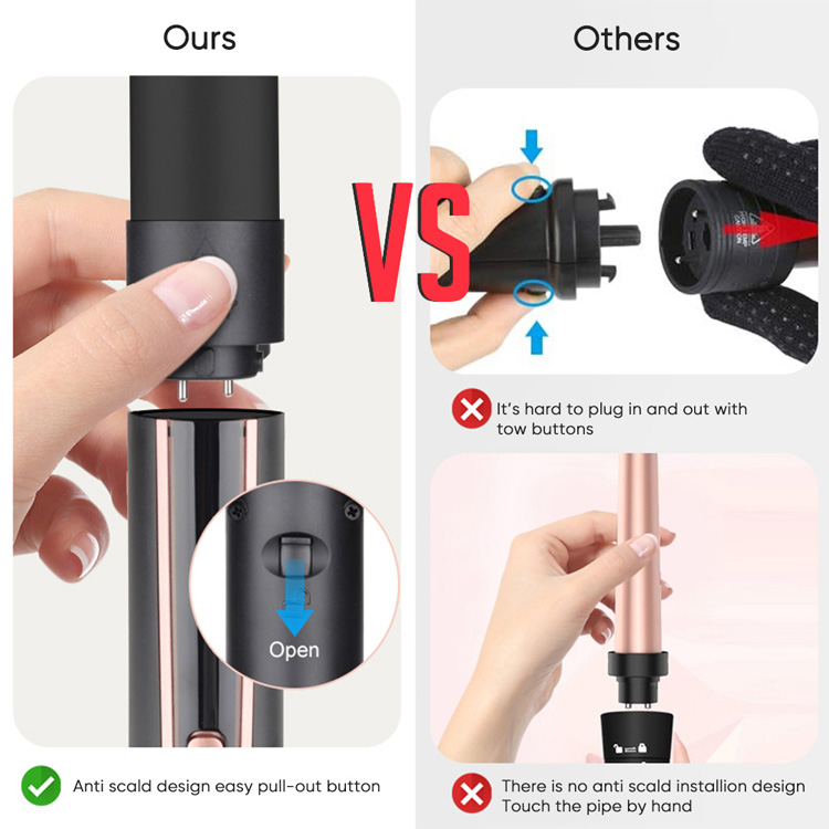 · Mudah & aman digunakan : Desain anti-scald dan tombol kunci terbuka lebih mudah untuk dimasukkan dan mengambil semua barel, memperbaikinya lebih erat. Braket pendukung melindungi meja Anda dari terbakar dan mempercepat pendinginan besi keriting.