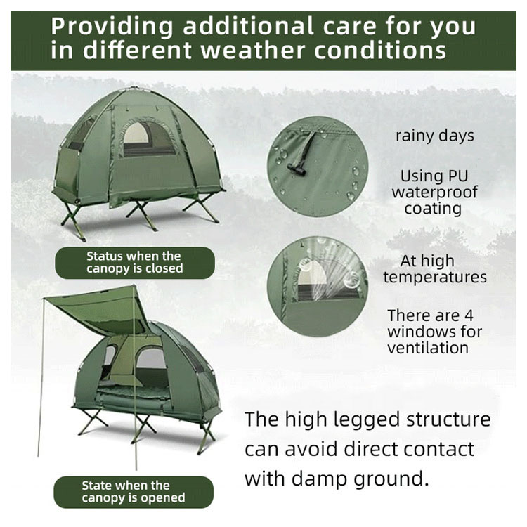 Dilengkapi platform tidur built-in yang ditinggikan yang menggabungkan perlindungan anti lembab dengan peningkatan kenyamanan, secara efektif memisahkan Anda dari tanah lembab dan meningkatkan isolasi.